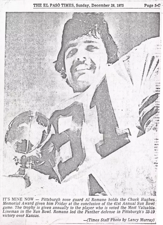 A nose tackle who played figuratively and literally at the heart of Pitt's defense, Romano was a consensus All-American and Outland Trophy finalist in 1976. He was responsible for the biggest defensive play of the 1976 title season when he halted a Syracuse ball carrier deep in Pitt territory on fourth-and-short, protecting a seven-point lead in an eventual 23-13 win. Romano was named the Most Valuable Lineman in the 1975 Sun Bowl, a 33-19 win over Kansas that served as the launching pad to Pitt's national championship campaign.