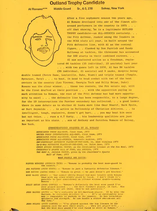 A member of Johnny Majors' first Pitt recruiting class in 1973, Romano helped build the foundation that produced one of the most dramatic turnarounds in college football history. Over his four seasons, the Panthers rose from Eastern doormat to undefeated national champions.